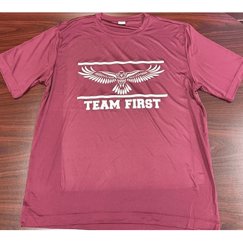 Performance maroon tee with white "Team First" Hawk logo across chest.