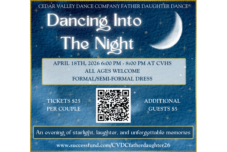 Come join us for a magical evening on April 18th, 2026 from 6:00pm-8:00pm at the Father-Daughter Dance hosted by Cedar Valley Dance Company at Cedar Valley High School! This enchanting event is open to all members of the community and will be held in the school commons. All dads, father figures, uncles, grandparents, and older brothers are encouraged to bring an honored guest to participate in a night of dancing, crafts, photos, and fun. Tickets are available for purchase online from March 21st through April 18th. Don't miss this special opportunity to create cherished memories with your shining star.