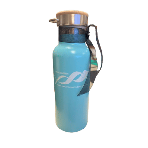 GSMST blue Infinite possibilities water bottle, with a metal carry handle and wood top.